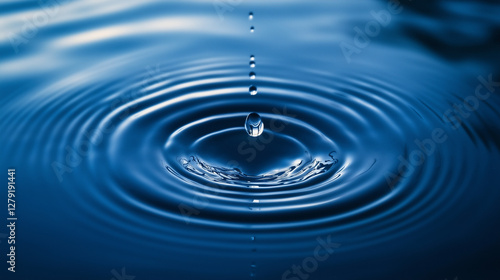 A single water droplet falling into a still pond, creating perfect ripples that spread outward