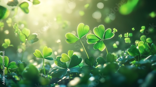 A sunlit, close-up scene of numerous shamrock leaves with a bright, ethereal glow against a blurred, light background with dew drops.