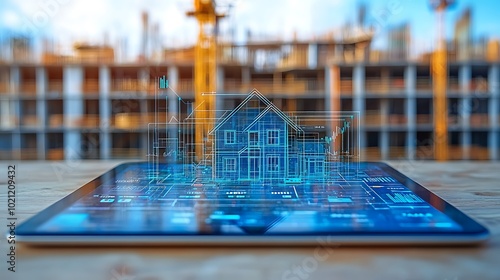 a tablet screen displaying a real estate app, where charts, graphs, and property listings are all trending upward. Behind the tablet