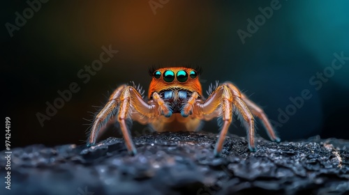A tight shot of a jumping spider perched on a wooden surface, surrounded by a softly blurred background