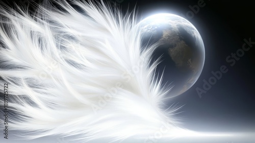 A tight shot of a white feather against a black backdrop Earth beneath a blue sky visible in the background