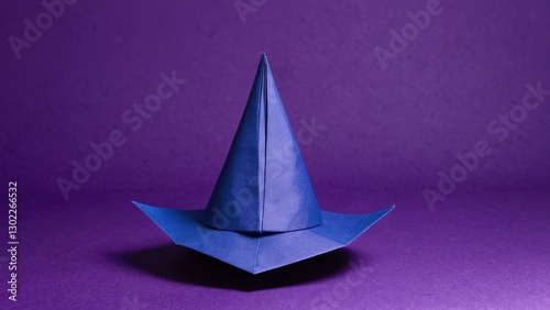 A whimsical paper witch hat stands out against a vibrant purple backdrop