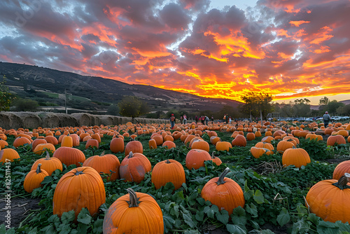 A wide shot of a pumpkin patch at sunset, with families picking pumpkins, the sky ablaze with warm colors, and hay bales in the background