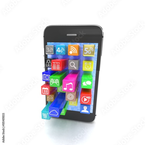 application software icons extruding from smartphone, isolated on white