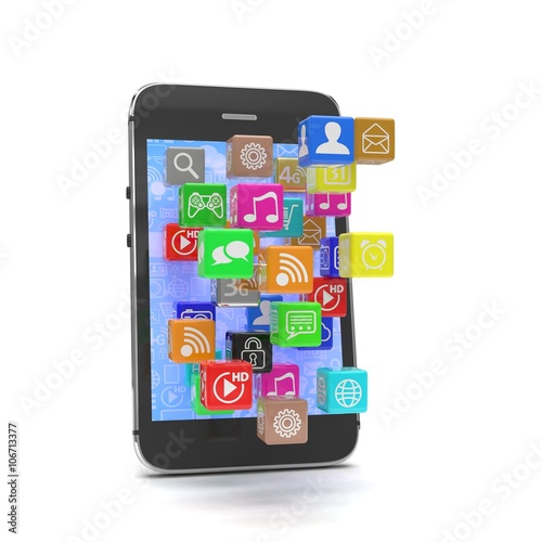 application software icons extruding from smartphone, isolated on white. 3D rendering.