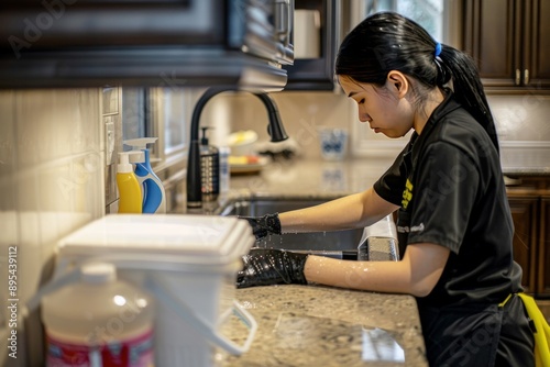 Asian cleaning service worker cleaning a kitchen counter, Generative AI