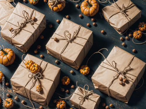 pumpkin, brown paper, twine, gift box, thanksgiving, harvest, home decor, celebration, table setting, festive season, autumn color, holiday spirit, warm tones