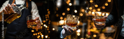 Barman pouring whiskey whiskey glass celebrate whiskey on a friendly party in restaurant