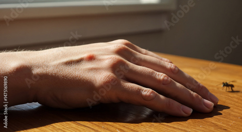 bee, hand, sting, ant, resting, table, closeup, sunlight, wood, indoor, observation, nature, human, close, insect, interaction, detail, calm, curiosity, environment, day, still, life, personal, minimalism, simplicity, household, sharpened, warm, brown, serenity, quiet, organic, micro, macro, small, moment, lifestyle, texture, finger, palm, light, shadow, contemplation, awareness, ambient, peaceful, casual attire, calmness