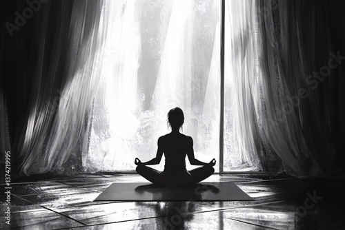 meditation, silhouette, yoga, black-and-white, mindfulness, peaceful, window, quiet, relaxation, balance, zen, minimalism, sharpened, serenity, stillness, morning, posture, symmetry, breathing, wellness, retreat, calm, solitude, strength, discipline, awareness, contrast, simplicity, soft light, clarity, contemplation