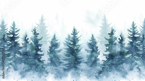 Blue landscape of foggy forest, winter hill. Wild nature, frozen, misty, taiga. watercolor background.
