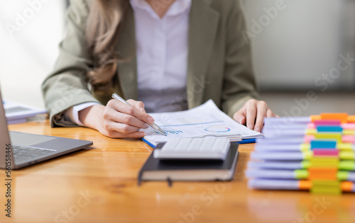 business Asian woman Accounting using calculating income-expenditure and analyzing real estate investment data report Financial and tax systems concept.