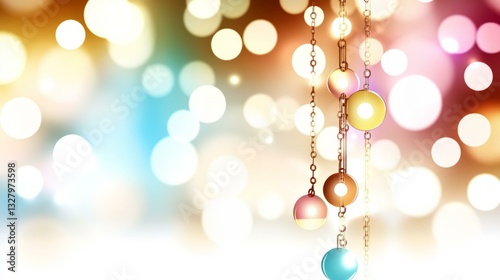 Colorful bokeh abstract background with hanging decorative spheres and warm glowing lights for festive design