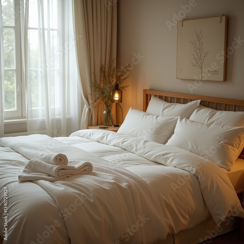 Cozy Hotel Bedroom with White Bedding and Natural Lighting