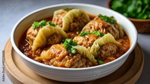 garnish, accessing, homemade, food, soup, bowl, dumpling, pasta, cookery, herb, comfort food, flavorful, hearty, delicious, meatball, meal, savoury, wooden table, sauce