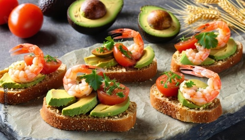 healthy, snack, fresh, shrimp, artisan, avocado, food, breaded, crustacean, epicure, bread, tomatoes, sandwich, seafood, culinary, garnish
