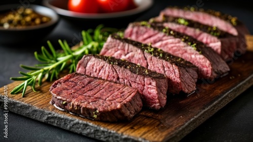presentation, fresh, dining, wooden board, raw, culinary, platter, sliced, chef, meal, rare, food, herb, steak, cut, garnish, eatery, kitchen, meat, beef, epicure