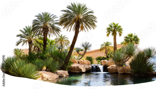 Desert oasis with palm trees, plants, a pond and a small waterfall, isolated on a transpare_1(78)
