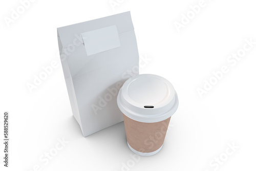 no people, white background, plank, table, white, drink, beverage, hot drink, coffee cup, refreshment, paper bag, packed, package, parcel, copy space, blank space