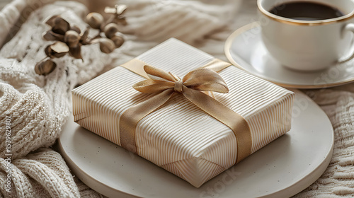 Elegantly wrapped gift with a golden ribbon alongside a coffee cup on a stylish setup