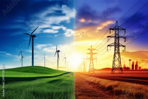 power, electricity, energy, sky, electric, field, pylon, tower, line, cable, wind, voltage, sunset, landscape, blue, high, industry, wire, green, generator, pole, technology, wire, summer, nature