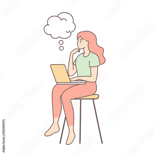 thought, person, adult, expression, curious, stool, laptop, imagining, cute girl, illustration, young, design, question, happy woman, girl, sitting, lap, thinking, problem, female, emotion, portrait, doubt, choice, character, a, face, woman, serious
