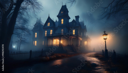 Foggy Night at a Mysterious Mansion- A haunting night scene of a mansion enveloped in fog, _1(113)