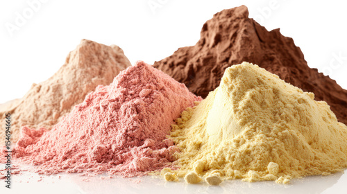 Four various heaps of protein powder – vanilla, strawberry, chocolate, and plain on transparent background