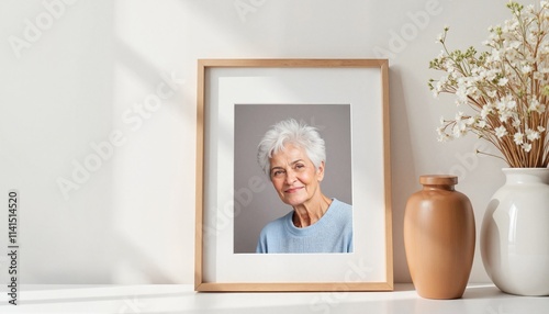 portrait, framed, vase, minimalist, home, stylish, bright, neutral, beauty, artistic, serene, elegant, classic, remembrance, decor, tribute, timeless, modern, sophisticated, soft, golden years, natural, graceful, closeup, traditional, mature, dedication, light, honoring, floral arrangement, quiet, refined, creative, memory