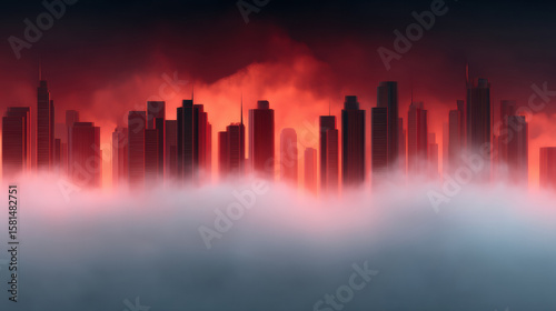 futuristic city skyline emerges through thick fog under a dramatic red sky, creating a surreal and intense urban atmosphere.