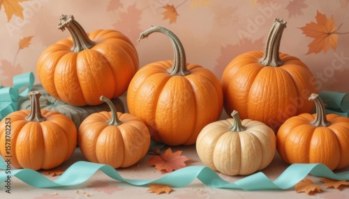 pastel, autumn, still life, orange, pumpkin, teal, ribbon, charming, decorative, fall, scene, composition, object, muted, colours, background, vintage, rustic, seasonal, cosy, gentle, autumn