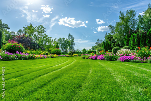 green manicured lawn, green backyard with colorful blooming flower beds.