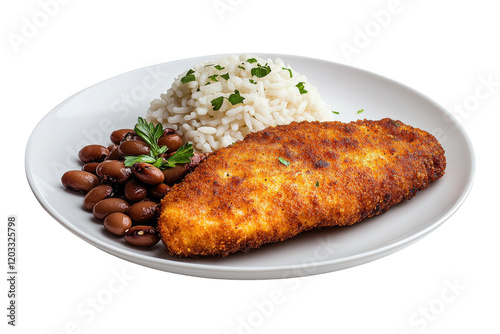 Grilled Fish Fillet with Rice and Beans on a White Plate isolated on transparent background