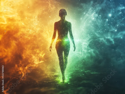 human, silhouette, aura, bioenergy, glowing, field, blue, green, gold, extending, body, balance, vitality, spiritual, energy, radiating, holistic, wellness, mystical, frequency, meditation, healing, visualisation, light, wave, power, cosmic, consciousness, chakra