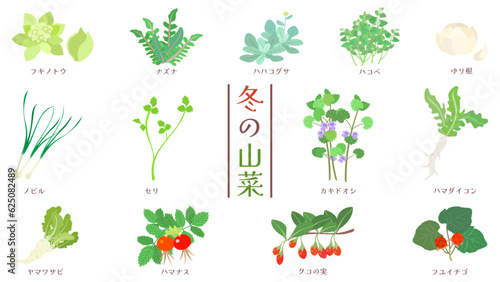冬の山菜のイラストセット。フラットなベクターイラスト。 Illustration set of winter wild vegetables. Flat designed vector illustration.