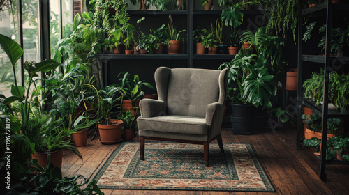 indoor, garden, greenery, plant, armchair, natural, light, vibrant, lush, houseplant, living, room, cosy, urban, jungle, green, interior, decor, nature, relaxing, home, design, modern, calm, peaceful, wood, flooring, foliage, earthy, inviting, tranquil, environment, sunlight, rustic, plant, collection, atmosphere, organic