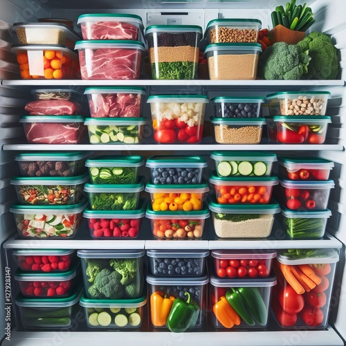 inside of a refrigerator, meticulously organized with various food items stored in clear plastic containers