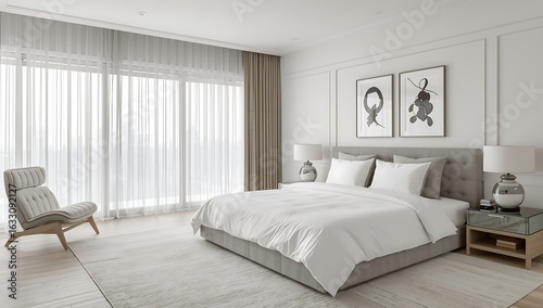 luxury bedroom, sleek modern design, king-size bed, elegant bedding, upscale interior, minimalist style, ambient lighting, cozy atmosphere, neutral color palette, contemporary furniture, plush cush