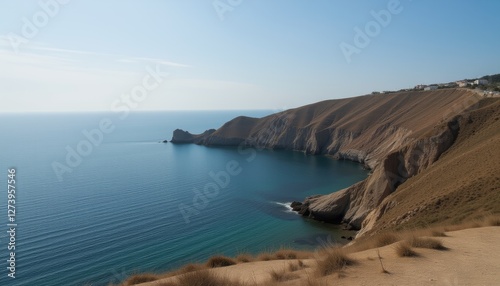 Majestic cliffside view overlooking the ocean with clear blue skies and distant mountains