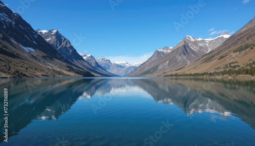 Majestic Mountain Valley Reflected in a Crystal Clear Lake under Blue Sky