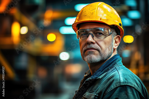 Middle-aged man in a steel plant, equipped with safety glasses and a yellow helmet, posing with a blurred industrial environment behind. Emphasizes professionalism and safety.