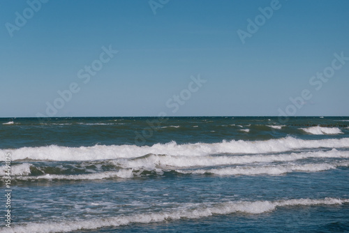 ocean is calm, the sky is clear. The water is blue and the waves are small. The sky is clear and blue. a tourist destination, a marine area with a sandy beach for walking.