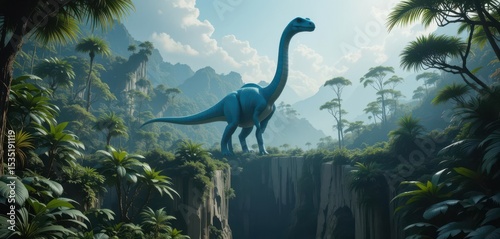 Painterly 3D Artwork An Azure Brachiosaurus Towers Over a Split Jungle World, Lush and Mysterious