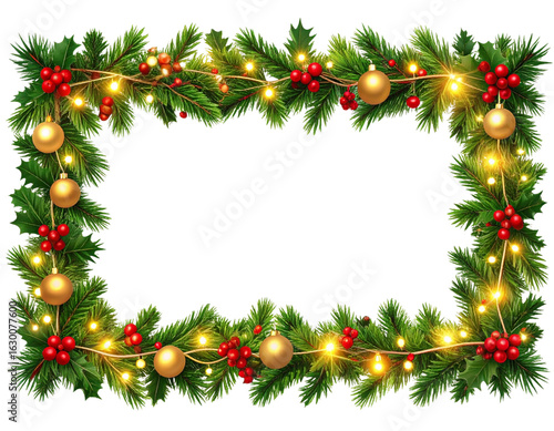 Pine Garland Holiday Frame with Red Berries and Gold Ornaments – Transparent PNG