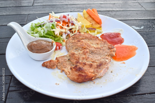 Pork steak with vegetable salads and sauces is a delicious and popular dish.