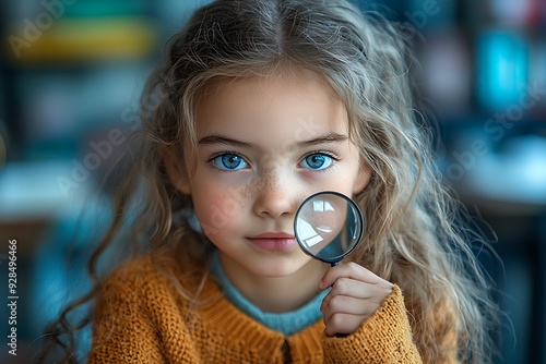 Portrait of cute schoolgirl sitting at desk holding magnifying glass in front of eye. Student girl in classroom in classroom at the elementary school