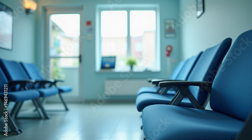 Quiet Anticipation: Close-Up of a Hospital Waiting Room with Modern Blue Chairs and Soft Ambient Lighting