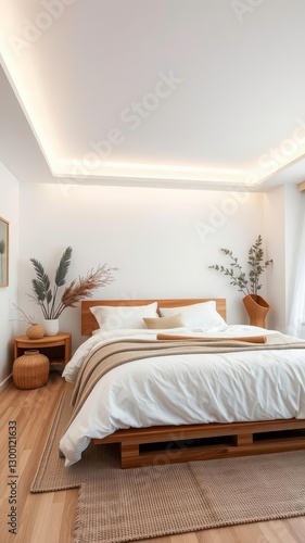 Serene White Bedroom with Ceiling Lights and Zen Inspired Natural Accents