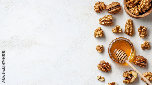 showcasing walnuts and honey, arranged with space for text on a clean, white background.