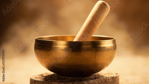 Singing Bowl with Mallet. A golden singing bowl rests on a textured surface. Inside the bowl, at an angle, is a wooden mallet. The background is soft and out of focus, creating a warm, contemplative